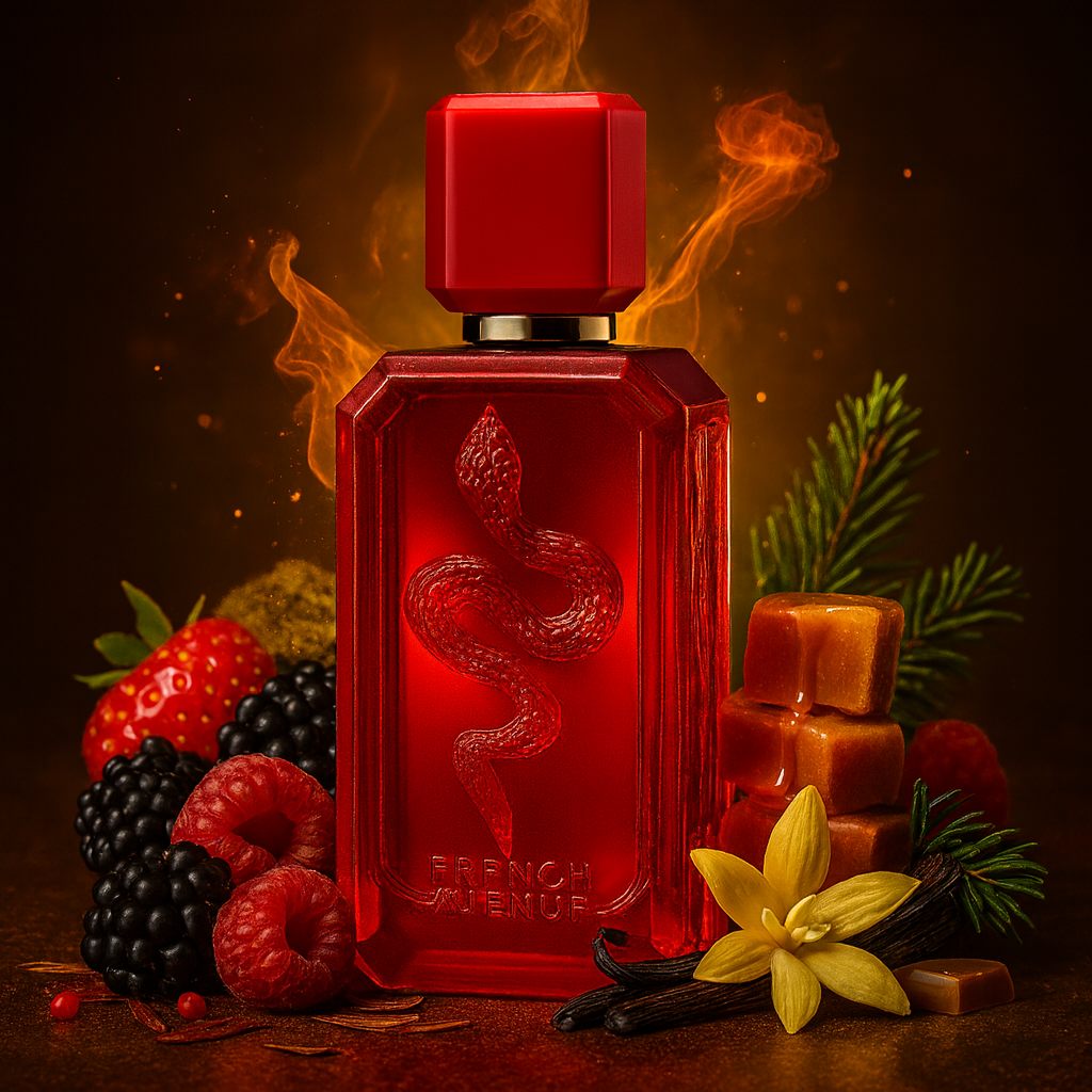 Veneno Scarlet – La tentation fruitée et boisée de French Avenue : un parfum audacieux, gourmand et inoubliable.